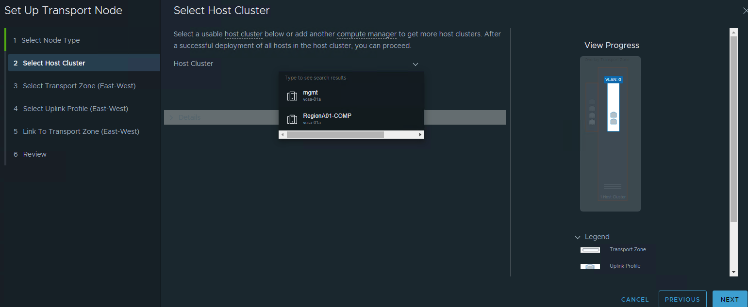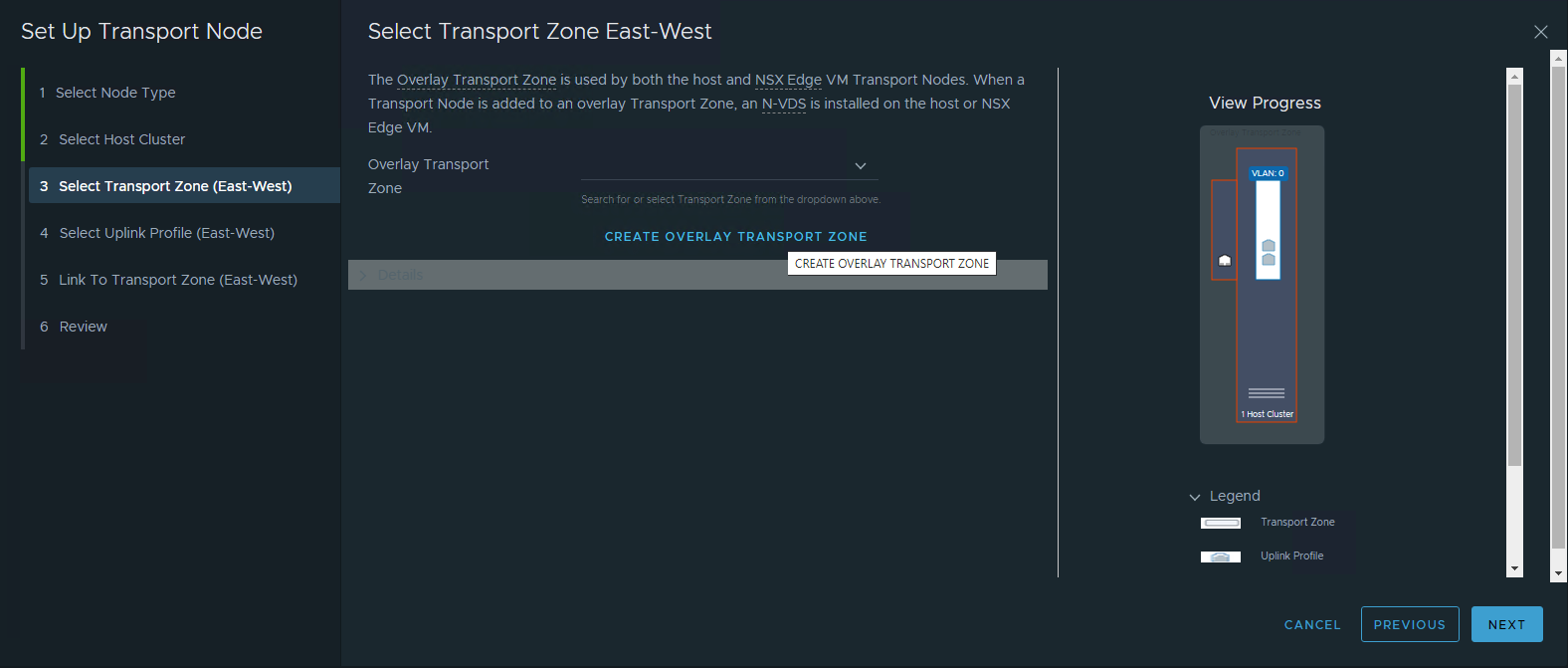 - Select the transport zone. the transport zone must be the same with the ESX TZ that previously created. If you require tenancy/DMZ, then configure separate TZ that linked between ESXi nodes and the target Edge nodes.