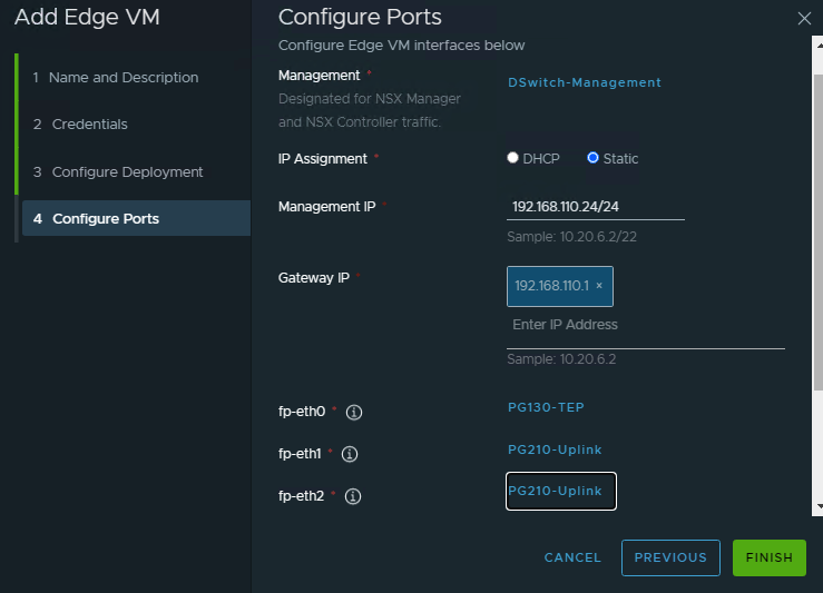 - Configure the detail of this edge VM. Select the Mgmt Port Group, set the static ip for the mgmt ip, then select the proper port group for the network interface. Normally we put eth0 for TEP overlay to communicate to the ESXi nodes. eth1 for first VLAN uplink. eth2 for the second VLAN uplink.