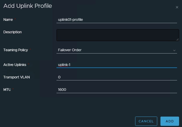 - Create new Uplink profile for Edge Overlay. We need to create new profile because the edge VM assigned directly into the portgroup TEP, so not using the VLAN ID.