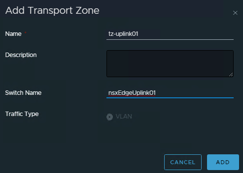 - Create New NSX Segment to be used for peering interface. Leave the connected Gateway empty. Use Transport Zone using uplink TZ. Enter the VLAN ID as zero.