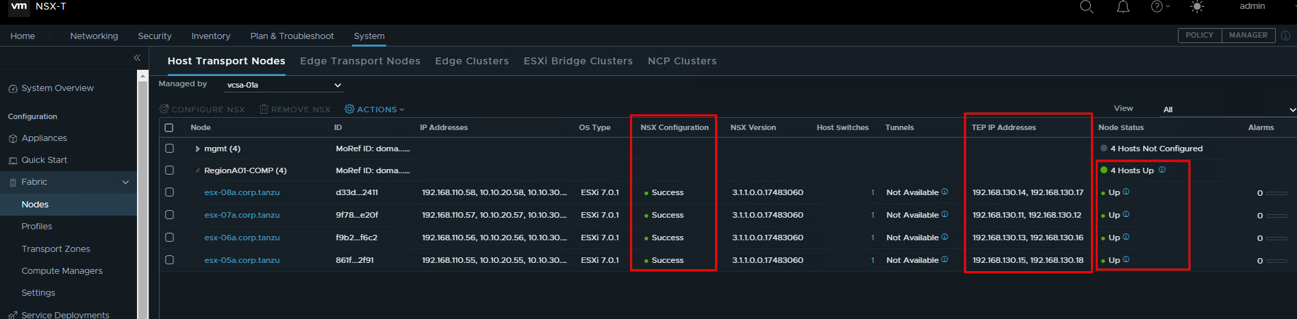 Wait for a while up to 30 seconds. - Check the Host Transport Node. Make sure that the NSX Configuration status are “Success”, TEP IP Addresses have 2 ip. and Node status are “Up”