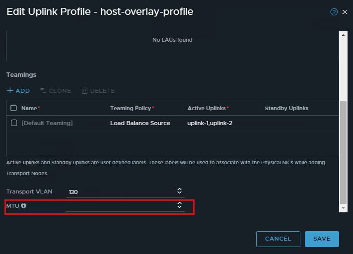 - Configure MTU on the VDS minimum 1600. Uplink should be minimum 2.