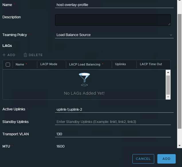 It would be best to use “Load Balance Source” as Teaming Policy. Enter two Active Uplinks. Make sure to input the correct Transport VLAN.