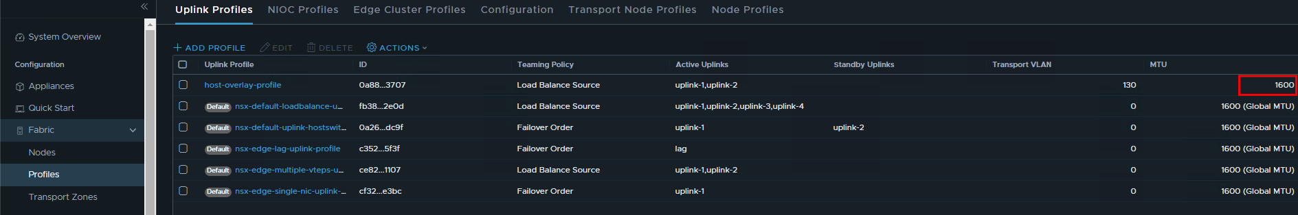 - Duplicate the browser tab so the existing wizard steps still persist. Then go to the uplink Profiles. See that the MTU of the profile created is hardcoded and not using Global MTU.