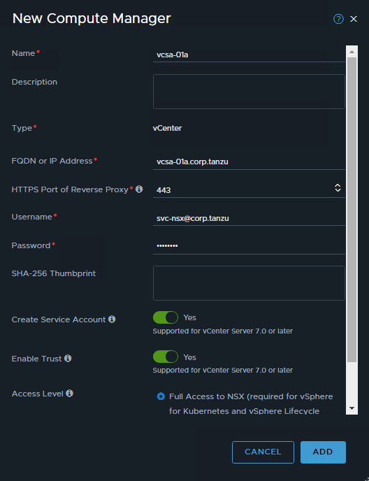 - Add the vCenter into compute manager. Use the service account that already configure in vCenter. Make sure to tick the Enable Trust.