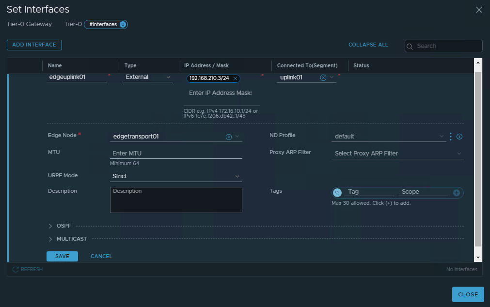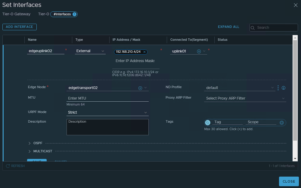 - Continue editing the T0 gateway by setting the peering interfaces. Configure both peering interface for each Edge nodes. Make sure to pointing the edge node.