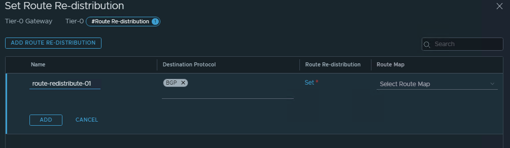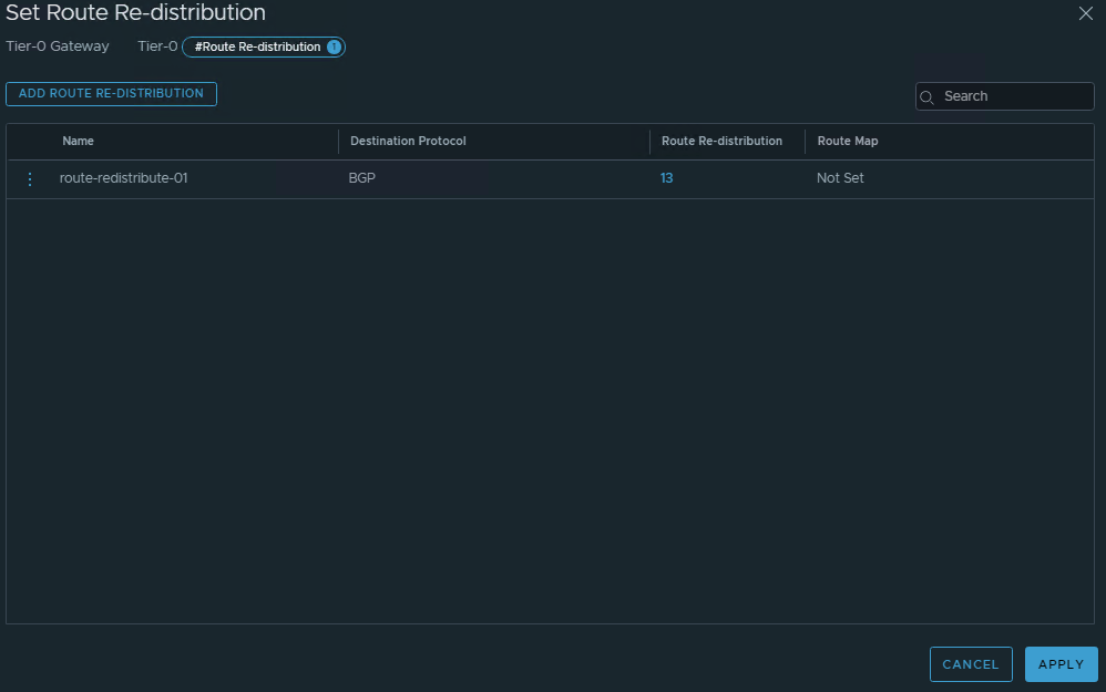 - Create Tier-1 Gateway. If there are no multitenancy or network requirement, use existing edge nodes. Configure the Route Advertisement.