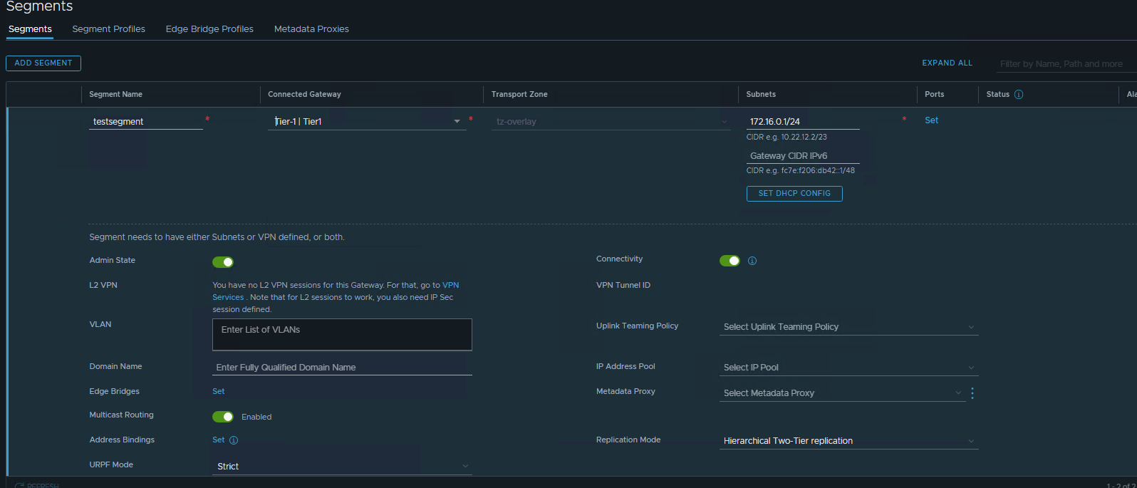 - Configure test Segment. Make sure to point to the Tier-1. Enter the subnet as the gateway address.